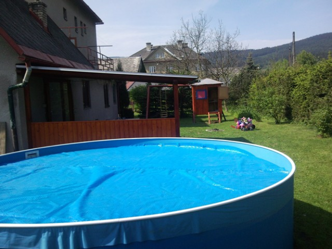 bazén o průměru 3,6m s vyhříváním pomocí solární plachty,