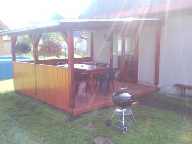 udržované travnaté zahradě , kde je možnost sportovních her a samozřejmě součástí je zastřešené venkovní posezení s ohništěm a grilem.