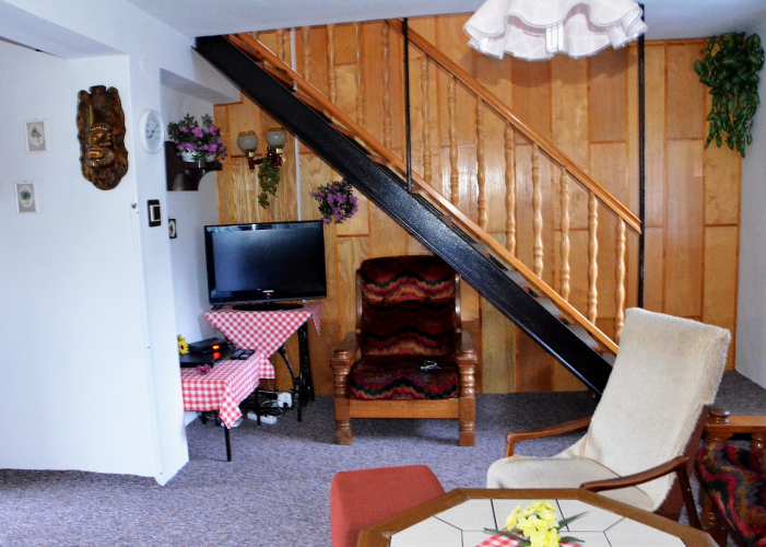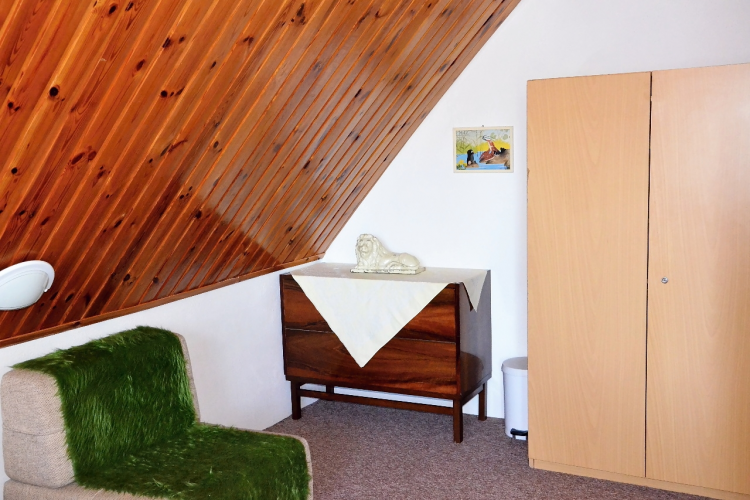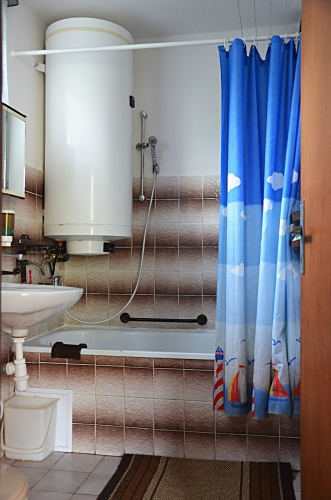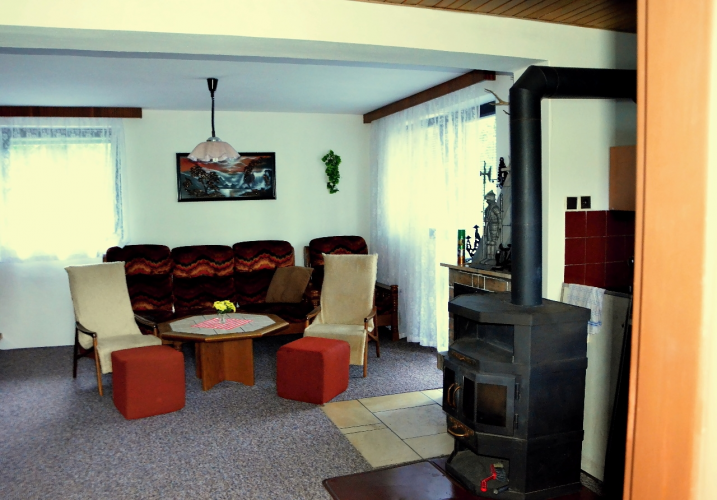 WC, bojler, umývadlo, vana, krb, sedací souprava, barevná televize, SAT,