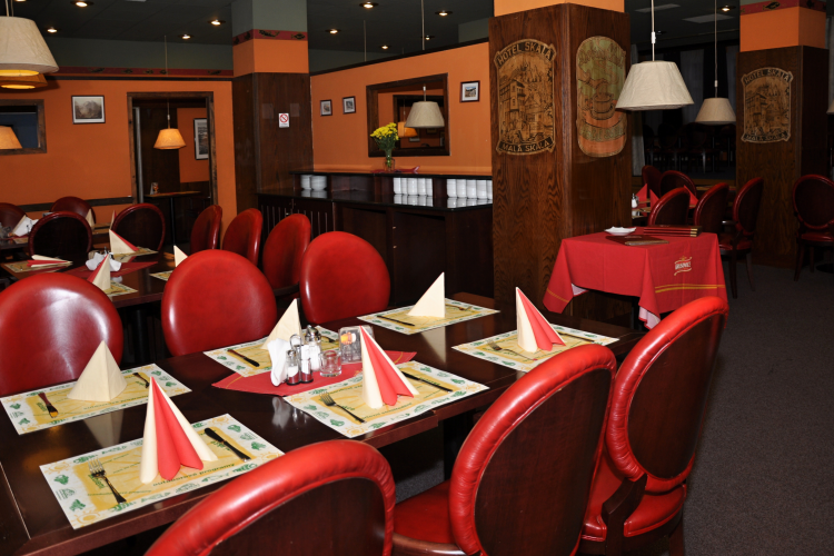 Nekuřácká restaurace s kapacitou 90 míst je členěna na tři polo-oddělené prostory, v kuřácké části spojené s barem je16 míst. Pro semináře, školení, podniková setkání či rodinné oslavy jsou k dispozici dva oddělné salonky se základním konferenčním vybavením. Za příznivého počasí máte možnost příjemného posezení na naší venkovní zastřešené terase v podloubí hotelu, kde Vám rádi nabídneme naše speciality připravované na grilu či při větších akcích grilování např. selátka, celé šunkové kýty apod. V naší kuchyni připravujeme veškeré pokrmy výhradně z kvalitních regionálních surovin od osvědčených soukromých dodavatelů. Polotovary, chemie a podobné nešvary "moderní" gastronomie k nám do kuchyně nesmí ! Vaříme zásadně ze základních surovin, tak jako naše babičky :)