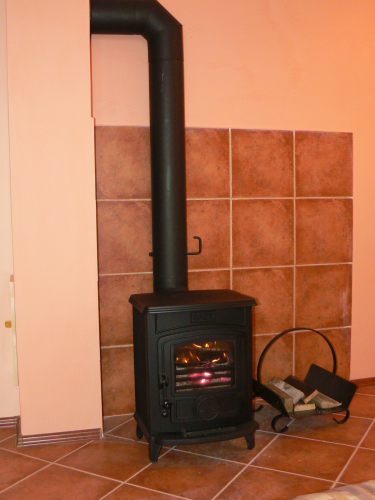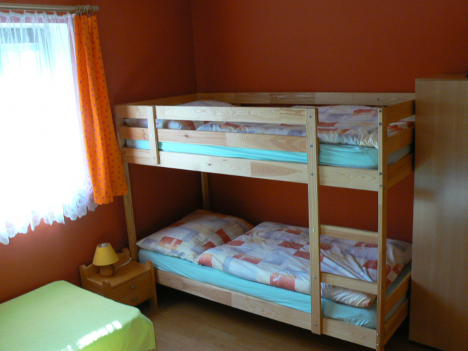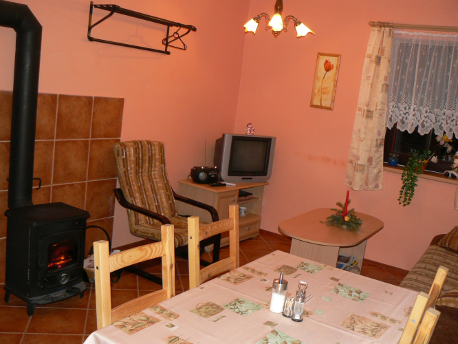 gauč, krbová kamna (možnost přitápění dřevem), TV, ložnice (příslušný
