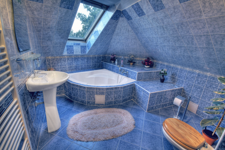 vybaveny rohovou vanou, jejíž kouzelné umístění v podkroví je nezapomenutelným