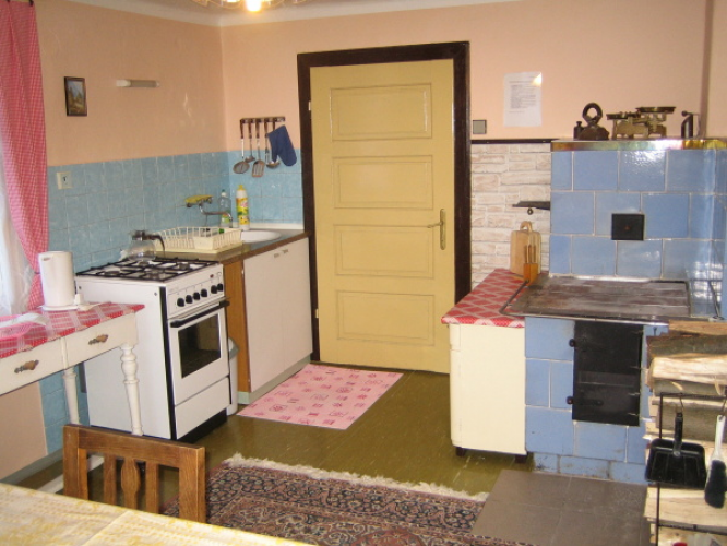 hrnky, skleničky, nože a příbory. K vytápění kuchyně a přilehlého pokoje slouží