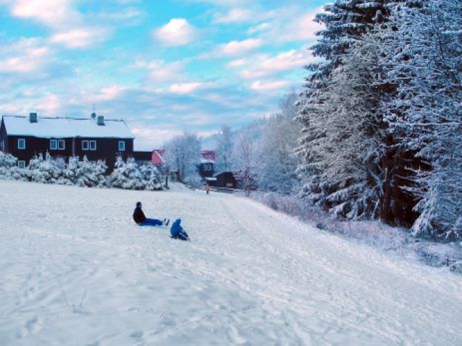 Vyžití na okolních loukách při sáňkování a bobování - místní přírodní „bobová dráha“ má až 600 m.