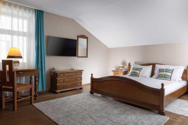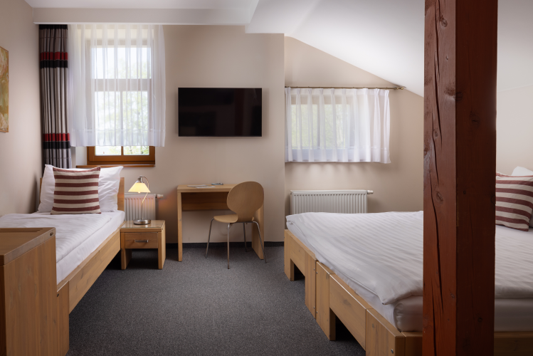 V hotelu nabízíme ubytování v nově zrekonstruovaných 13 pokojích s 33 lůžky, penzion disponuje 10ti pokoji pro jednotlivce i rodiny. Pokoje jsou vybaveny barevným televizorem, internetovou přípojkou, telefonem s přímou volbou, minibarem s výběrem alkoholických a nealkoholických nápojů, koupelnou se sprchovým koutem či vanou, vysoušečem vlasů. Pokoje v penzionu jsou zařízeny podobně jako naše hotelové pokoje. Disponují vlastní zcela novou moderní koupelnou se sprchou a WC. Wi-Fi a Smart TV na pokoji.