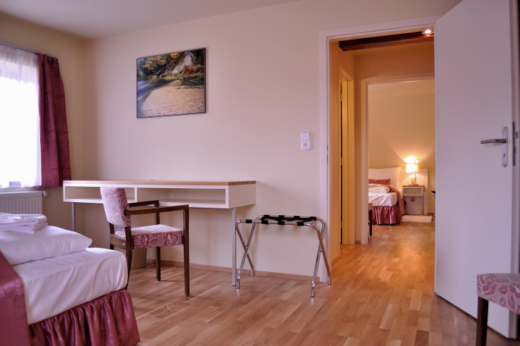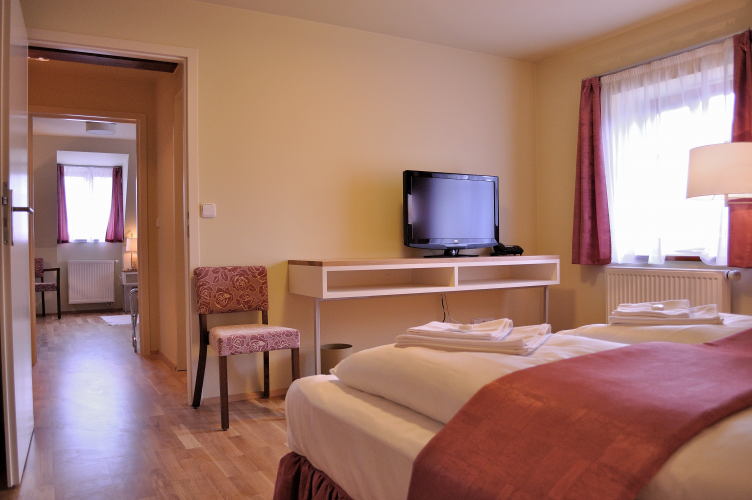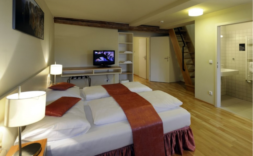 podkrovní pokoje a apartmány, dále jeden bezbariérový pokoj pro hosty s