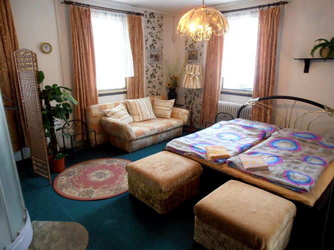 V penzionu se nachází 1 dvoulůžkový pokoj a 2 čtyřlůžkové pokoje vybavené umyvadlem a sprchou,TV,WIFI FREE,lednicí ve čtyřlůžkových pokojích,fénem,rychlovarnou konvicí.WC je společné na poschodí.Vlastní parkoviště je hlídané kamerovým systémem.V přízemí penzionu je restaurace-bar s minutkovými jídly,poháry,zákusky,teplými a studenými nápoji,míchanými alkoholickými a nealkoholickými ovocnými a mléčnými koktejly.
