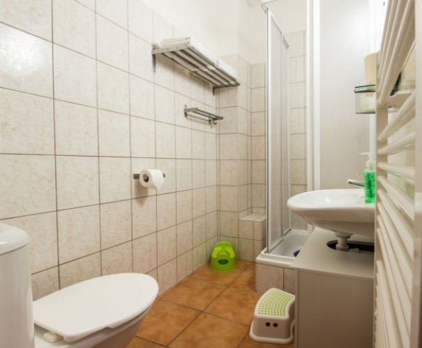 Najdete u nás i přebalovací stůl, nočník, dětské sedátko a stupátko, aby vaše dítko dobře dosáhlo na umyvadlo.