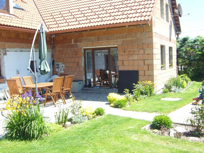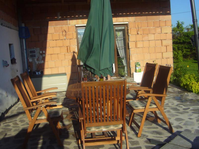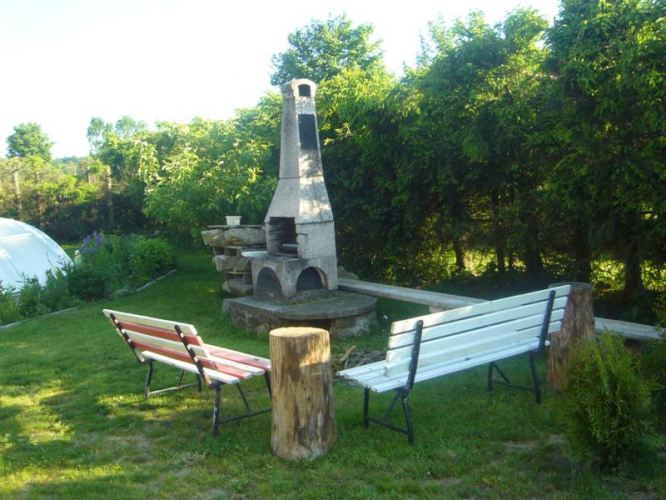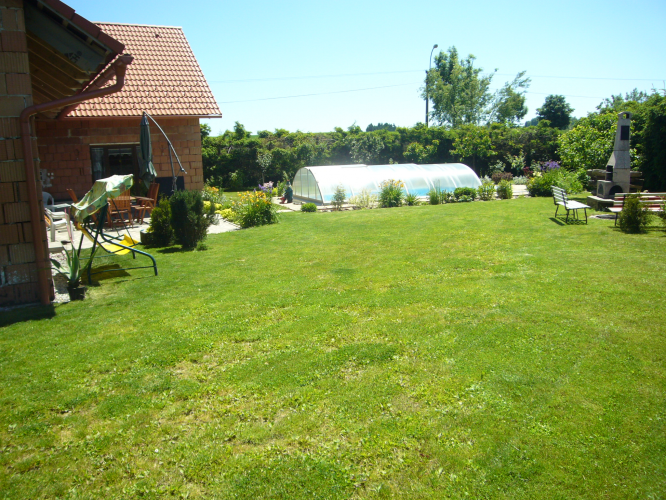 Předmětem pronájmu je i zahrada o velikosti cca 1000 m2 situovaná na jih. Z jedné strany je krytá chalupou a z ostatních stran vzrostlými smrky, čímž poskytuje ničím nerušené soukromí. Zahrada je přístupná z kuchyně a z chodby, na které je příjemné posezení. Na terase je k dispozici zahradní houpačka, rozkládací dřevěný stůl s velkým slunečníkem, šest polohovacích dřevěných křesílek a 6 plastových a plastová bedna, která je určena k úschově polstrování na křesílka a k houpačce. Pro ty, kteří dávají přednost plavání v čisté vodě před koupáním v rybníku je k dispozici venkovní zapuštěný bazén 6m dlouhý, 3,5m široký a 1,5m hluboký, vybavený pohodlným schodištěm, protiproudem a osvětlením. Je přístupný přímo z terasy. Voda v bazénu je ošetřována výkonnou pískovou filtrací a mořskou solí, tzn. bez chemických přípravků. Teplota vody v bazénu se pohybuje od května do září v rozmezí 22 až 32 st. C v závislosti na počasí. Zastřešení bazénu chrání Vaše děti před nechtěným pádem do vody , za chladého počasí zpomaluje chladnutí vody a za teplého počasí vyhřívá vodu v bazénu. Díky zastřešení se dá v bazénu koupat i za chladnějšího počasí. Za horkých dnů se dá zastřešení bazénu odsunout a vychutnat si koupání pod modrou oblohou. Díky tomu, že je zahrada situována na jih, lze se na ní opalovat od rána do večera. Ke slunění jsou k dispozici nejen 4 lehátka a dvě skládací podložky k ležení, ale i dostatek místa na zahradě. Pro děti je zde pískoviště, houpačka se skluzavkou a velká trampolína. Pro příjemně strávené večery lze využít zahradní krb s udírnou a s posezením u ohniště. Na terase je venkovní osvětlení. Do zahrady je přístup z kuchyně, z chodby a od polní cesty, která vede kolem zahrady. Zahrada se dá uzamknout a jsou na ní 3 parkovací místa pro auta. Z polní cesty je přístup do kolárny, uzamykatelné bezpečnostním zámkem.