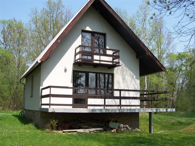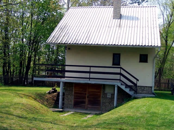s výhledem na řeku. Pod chatou se nachází garáž s kánoí.
