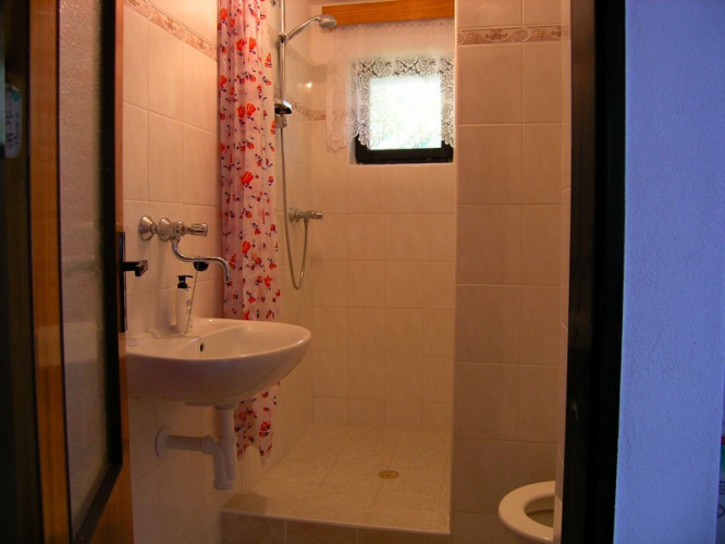 vybavená kuchyně a koupelna se sprchovým koutem a WC. Nahoře se