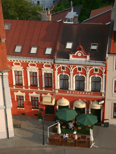- Letní zahrádka s výhledem na Riegrovo náměstí a kostel Panny Marie
